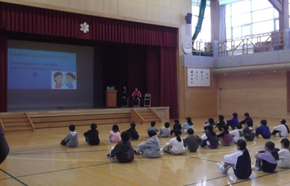 毎年始業式には4~6年生が作文発表を行っていましたが、今回は「冬休みの思い出と3学期に頑張りたいこと」をスライドにまとめ、発表しました。